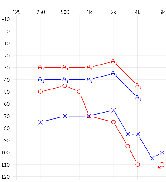 왼쪽은 고도난청, 오른쪽은 중도에서 고도난청까지 떨어지는 감각신경성난청으로